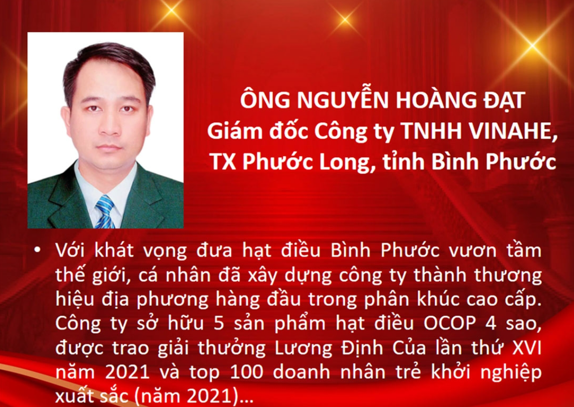 Với những cống hiến và khát vọng đưa hạt điều Bình Phước vươn tầm thế giới, cá nhân đã xây dựng công ty thành thương hiệu địa phương hàng đầu trong phân khúc cao cấp. Công ty ông sở hữu 5 sản phẩm hạt điều đạt chuẩn OCOP 4 sao, được trao giải thưởng Lương Định Của lần thứ XVI năm 2015 và top 100 doanh nhân trẻ khởi nghiệp xuất sắc (năm 2001)… Ông Nguyễn Hoàng Đạt – Giám đốc Công ty TNHH VINAHE đã vinh dự và hân hạnh được bình chọn, góp mặt trở thành 1 trong 50 “Công dân Bình Phước ưu tú” tại lễ kỷ niệm 50 năm Ngày Giải phóng tỉnh.